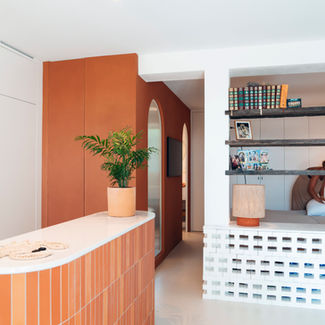 The materials used include custom-made terracotta slats by Vagh, Calacatta marble for the bathroom, Zucchetti faucets, and Fornace Brioni floor tiles.